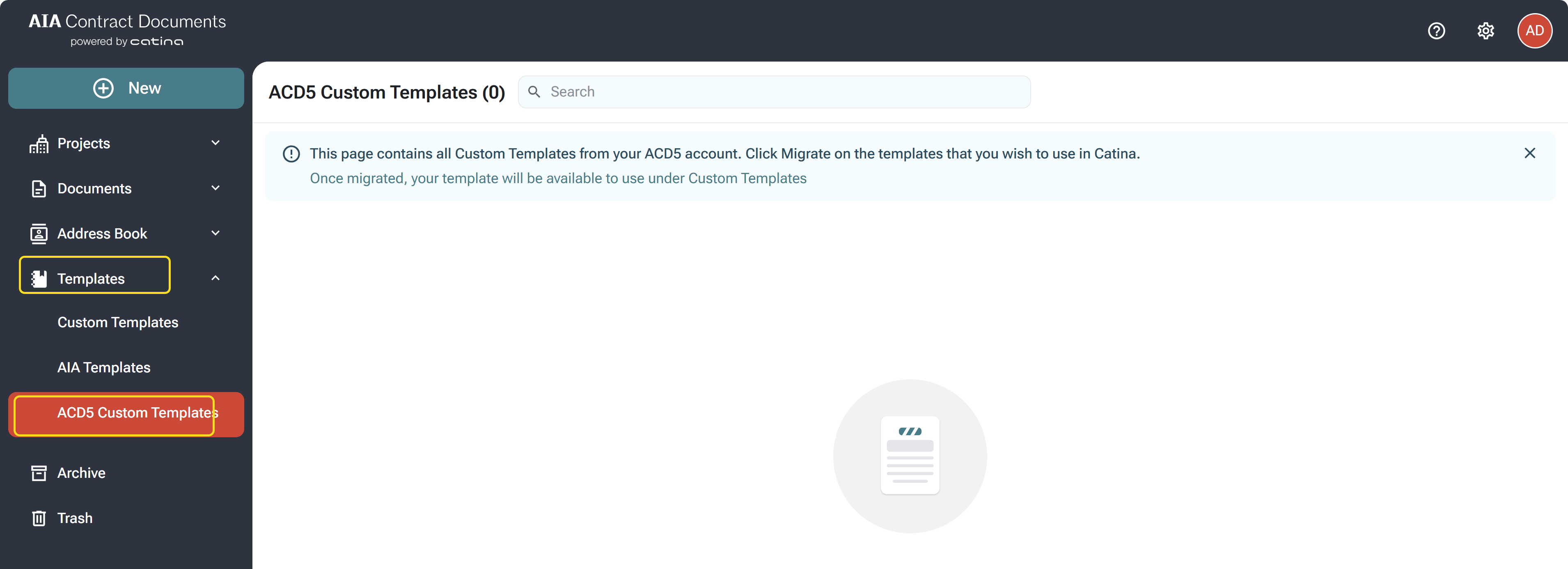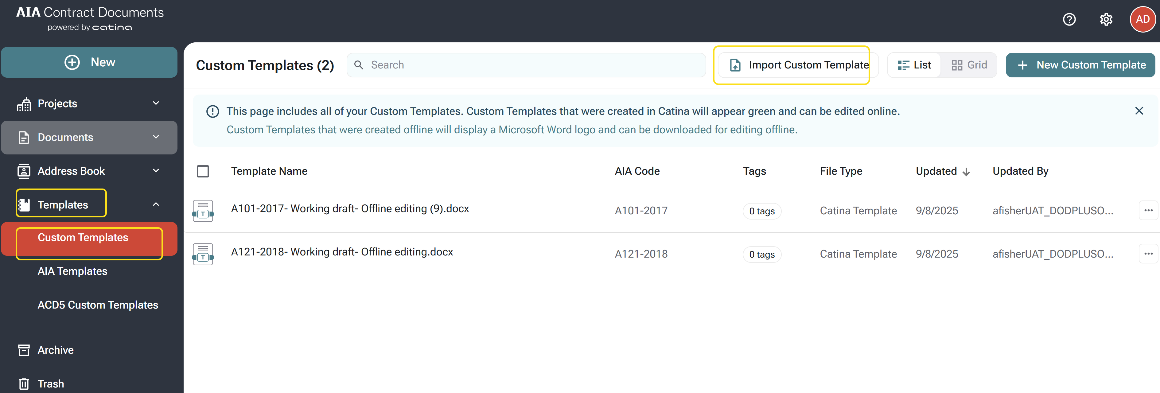 AIA Contract Documents is excited to announce the ability to migrate online ACD5 custom templates into the new Catina Platform. This includes templates that were created within the ACD5 online service or Word Documents that were downloaded from the previous platform. This article outlines the steps to migrate these templates over.
