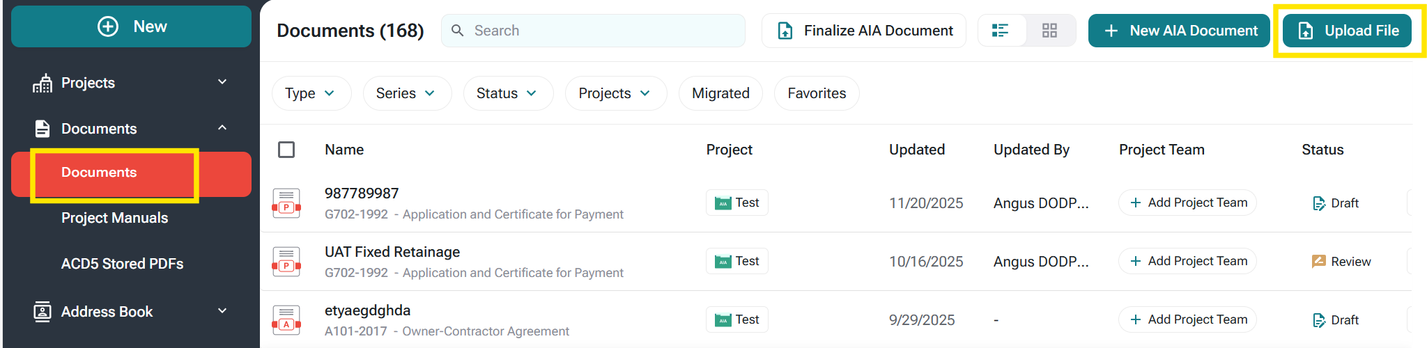 Note- You can also upload your ACD5 draft document from the Import button within the AIA Documents tab.