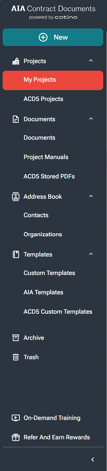 Project - Create a new project where all related documents, details, and team members for a specific construction job are organized and managed. AIA Document - Create a New Document from a list of All standardized AIA contracts or existing customized templates Project Manual - Create a single PDF file that combines multiple project documents—both Catina-generated and external PDFs—into one organized package. Custom Template - Create a reusable document customized with your organization's preferred edits and information. Contact - Create a new contact including contact details with whom you can communicate and share project-related documents Organization - Create a new organization including organization details fora company or entity involved in managing and collaborating on project documents. Finalize AIA Document - Import and finalize ACD5/Catina documents. ACD5 documents can be reviewed, edited, and finalized. However, cannot be taken back offline at this time. Import Custom Template - Import customized ACD5 Templates | |
