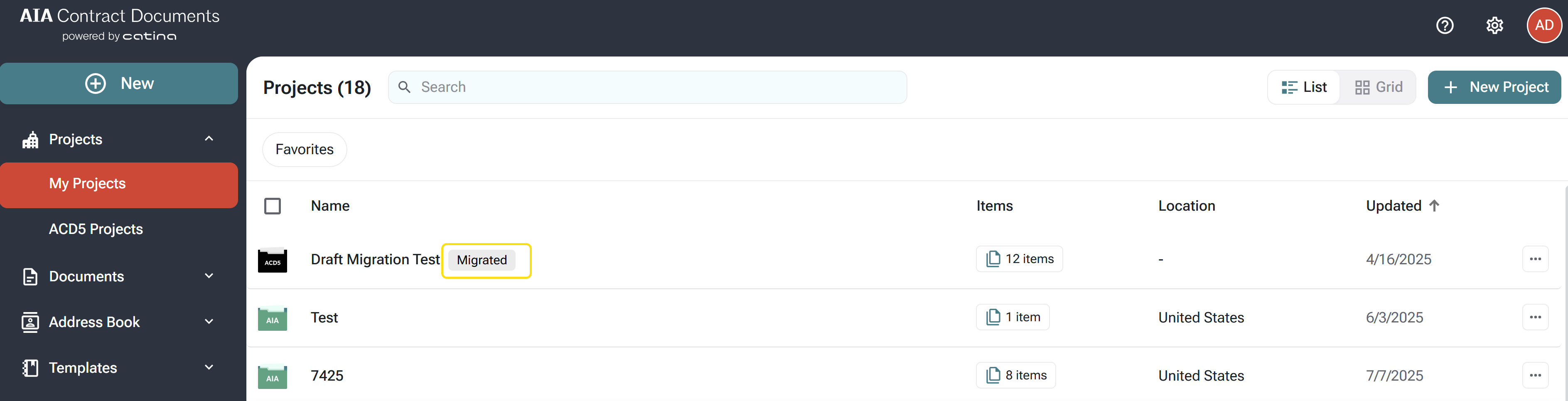 Once migrated, a green checkmark will appear next to the project name, and the status will update to "Migrated" on the list. The project will also appear under the "My Projects" tab with a "Migrated" label.