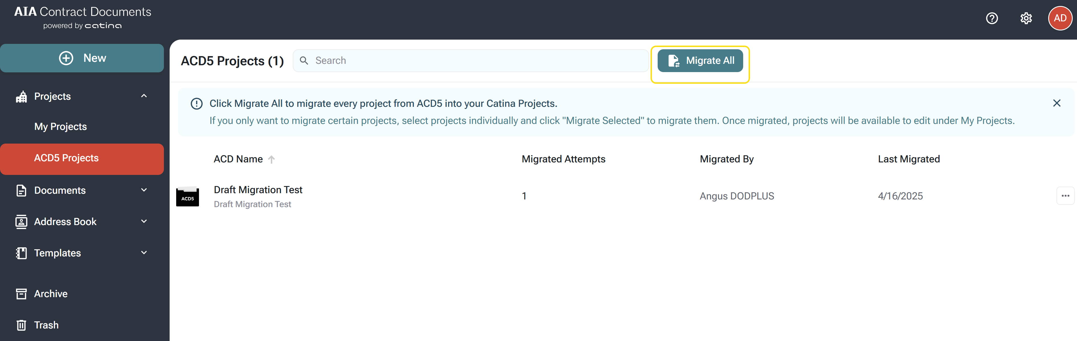 You can quickly migrate all projects by selecting "Migrate All". For accounts with large amounts of projects it might take 24 hours. Troubleshooting Tip: Triggering a migration will only move over current data, so any documents edited or created after migration will not come over. We recommend only migrating over completed projects or projects you are no longer working on within ACD5 to reduce having to migrate projects more than once or duplicating data within Catina.