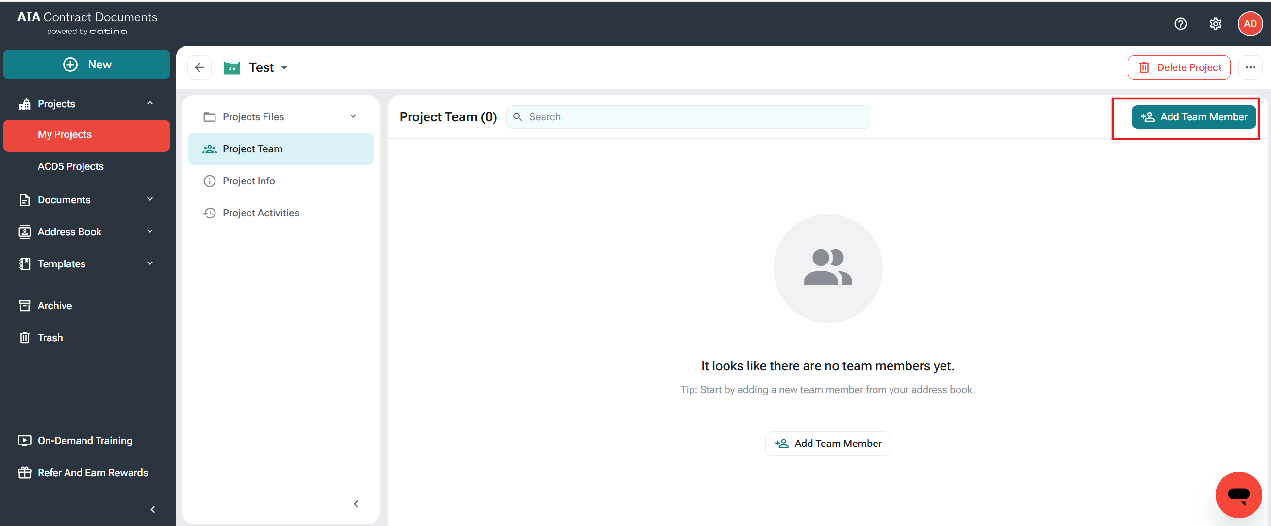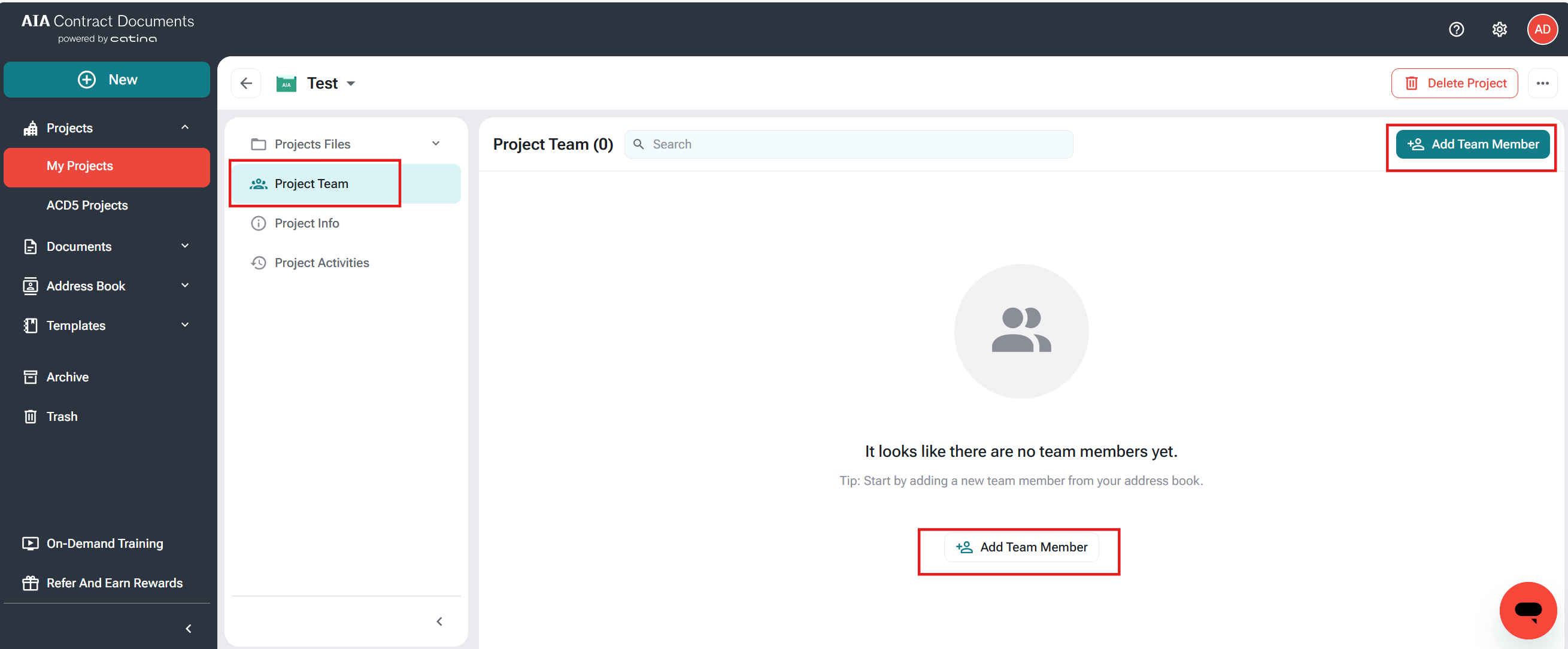 8. Select Add Team Member to add additional Project Team Members