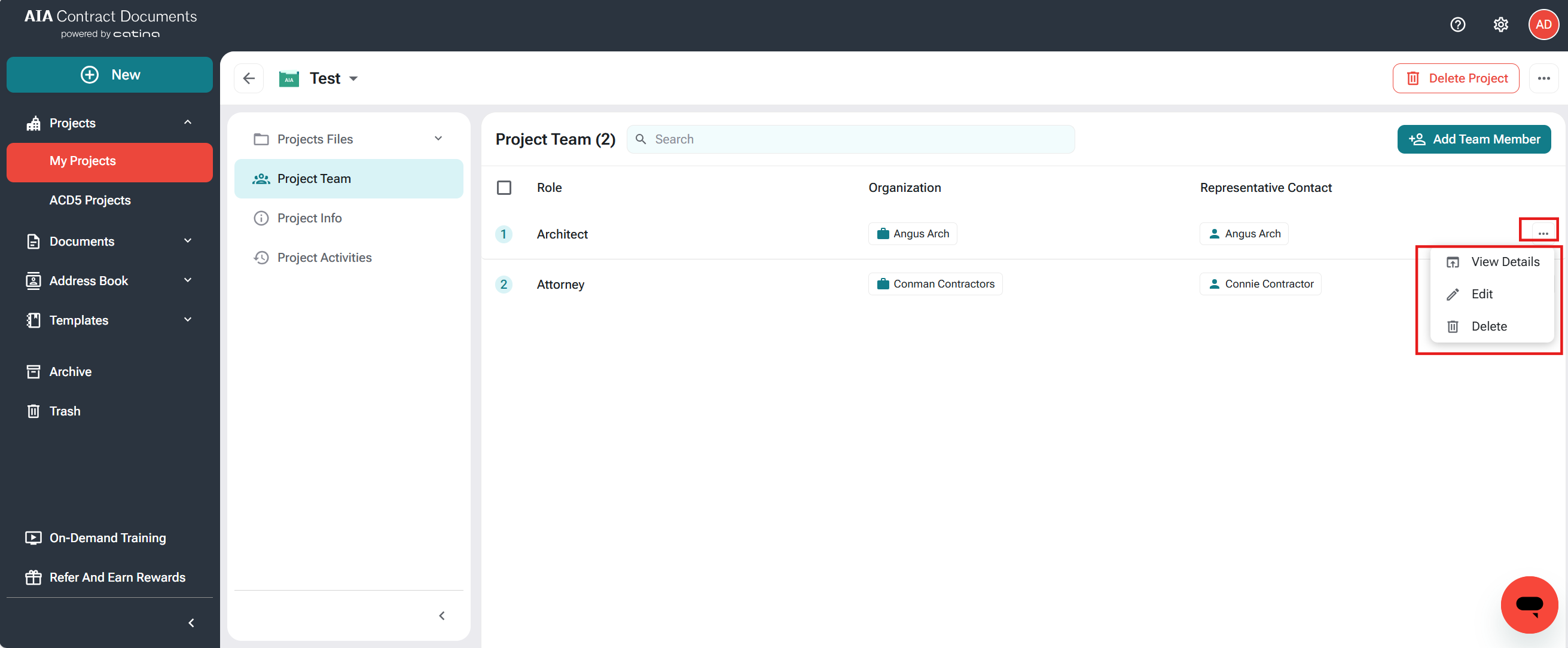 - Click the 3-dot menu to View Details, Edit or Delete a team member from the project.