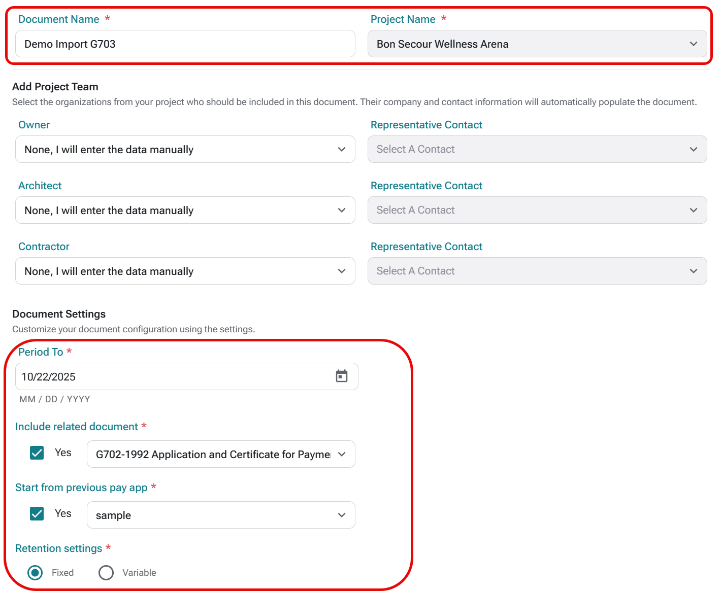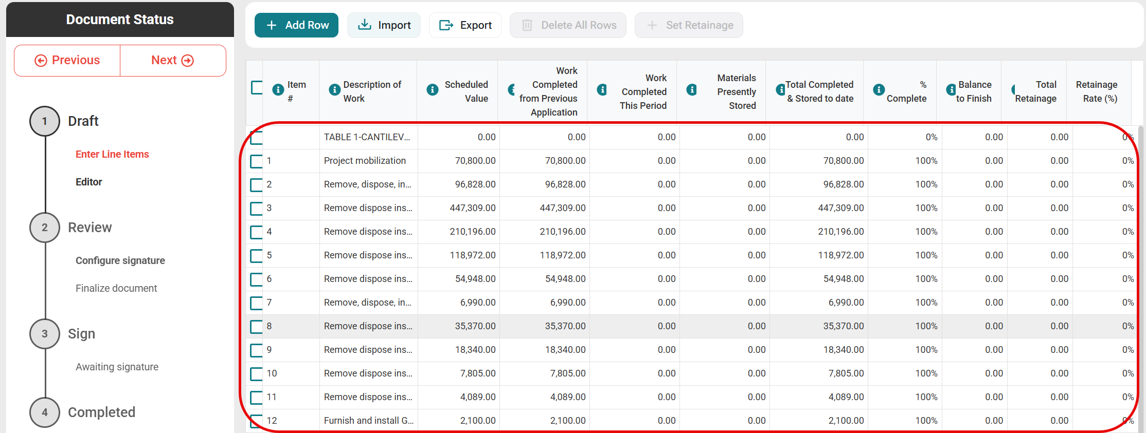 5. The document editor is where you can edit the information pertaining to the G702 Payment for Application. Within Catina, your project details and line item data will automatically populate into your payment application, saving you time and reducing the chance of error. Once you enter the retainage and any necessary change order information, the related fill points will automatically calculate for you.