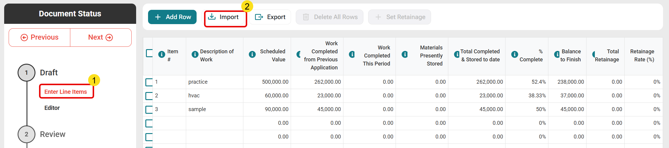 2.. Enter line items will guide you to entering in your line items within the online document editor. There is built-in logic and calculations to reduce errors and make the completion process more efficient
