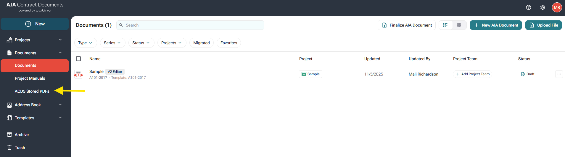 The subfolder "Migrated Documents" is now "ACD5 Stored PDFs". This is where all finalized PDFs from ACD5 have been automatically migrated for you, allowing you access to any historical data post migration. You can download any of these PDFs for your reference.