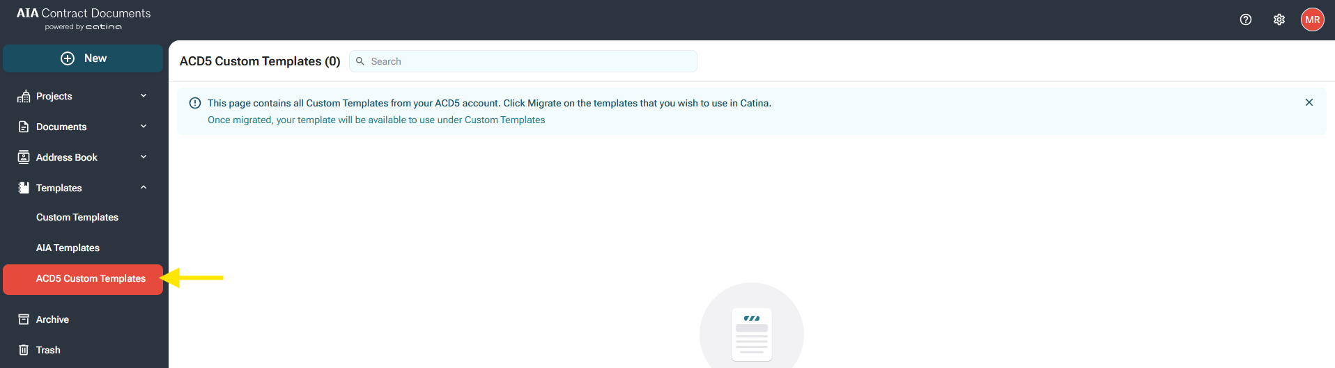 Under the templates tab, we updated the "Migrated Templates" subfolder to "ACD5 Custom Templates". Here you will find all custom templates used within the ACD5 platform with the ability to migrate into Catina.