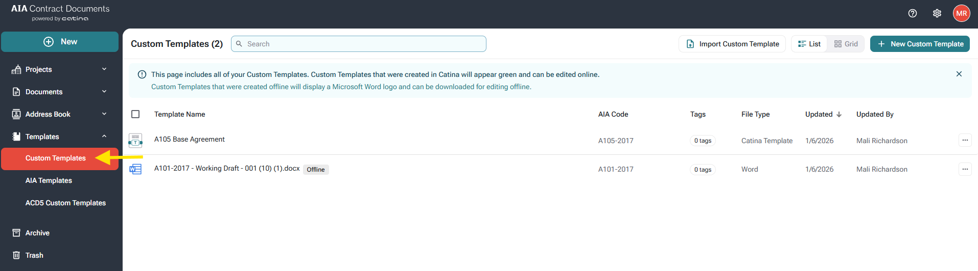 We simplified the folders found under Templates and removed the "Offline Templates" subfolder. Now all custom templates will be stored within the "Custom Templates" subfolder. Custom templates created in Catina can be identified via the small icon with the green ribbon or the left under file type. These documents can be edited online. Custom templates created offline are identified via a Microsoft Word logo and have a File Type of "Word”.