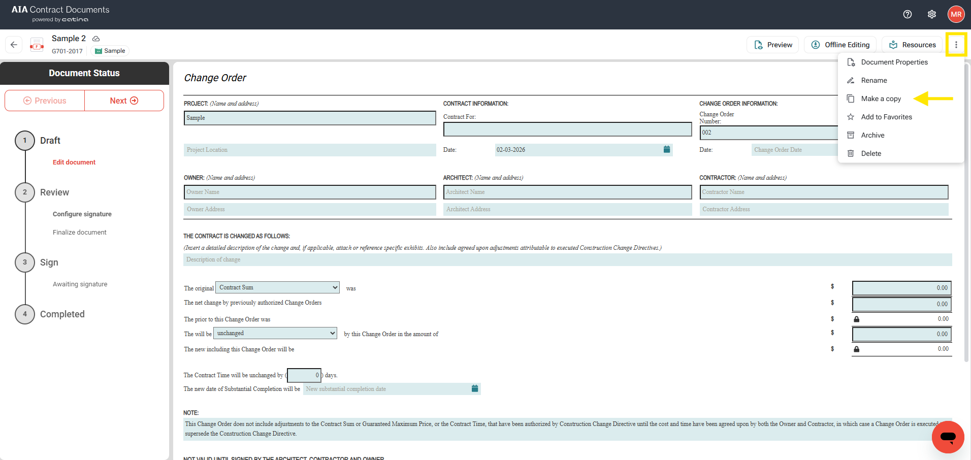 In this article we walk through how to create a Change Order (G701, G701S, G731, G741, G741S) in Catina, take the document offline, creating future Change Orders quickly, along with highlighting the improvements released February 2026. This includes the unlocking of fields and ability to duplicate Change Orders.