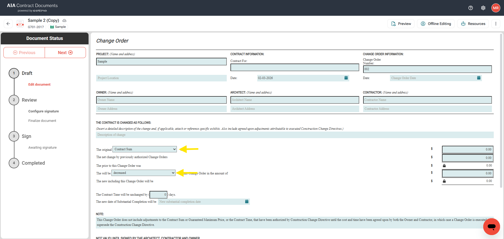 - Follow the same path as your first Change Order to edit (online or offline) and finalize your document.