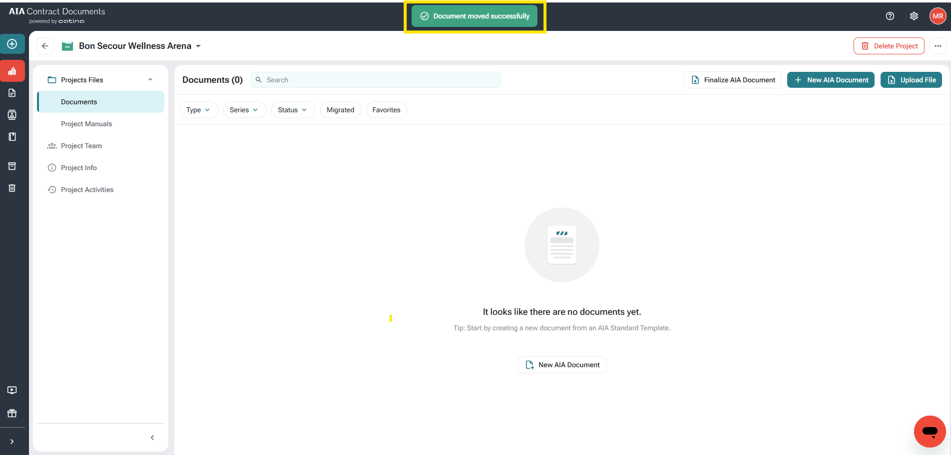 After moving the document, a notification banner will appear at the top of the screen confirming the move was successful.